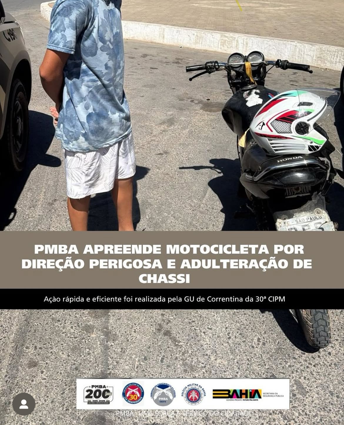 Na última quinta-feira, 9/10, por volta das 14h00, durante rondas ostensivas realizadas pela guarnição de Correntina no perímetro urbano, a equipe visualizou, na Praça Miguel Calmon, um indivíduo conduzindo uma motocicleta e realizando manobras perigosas (malabarismo), colocando em risco a própria integridade e a de terceiros.