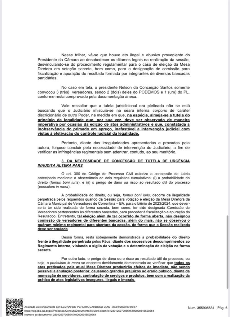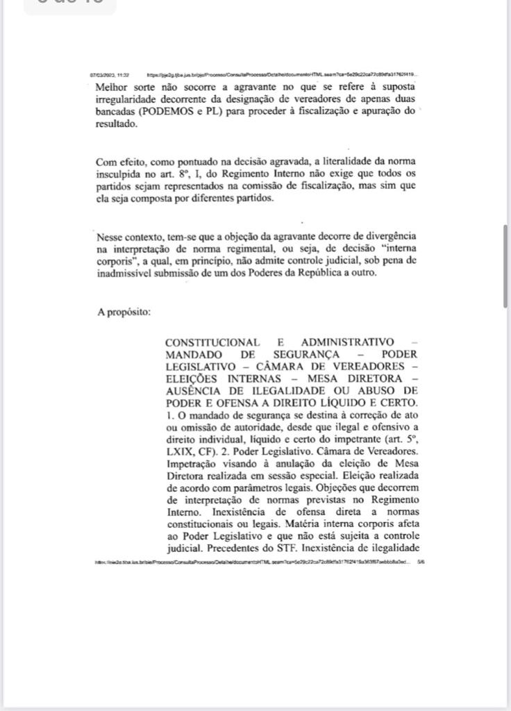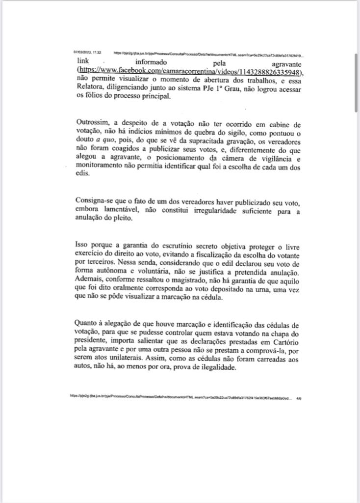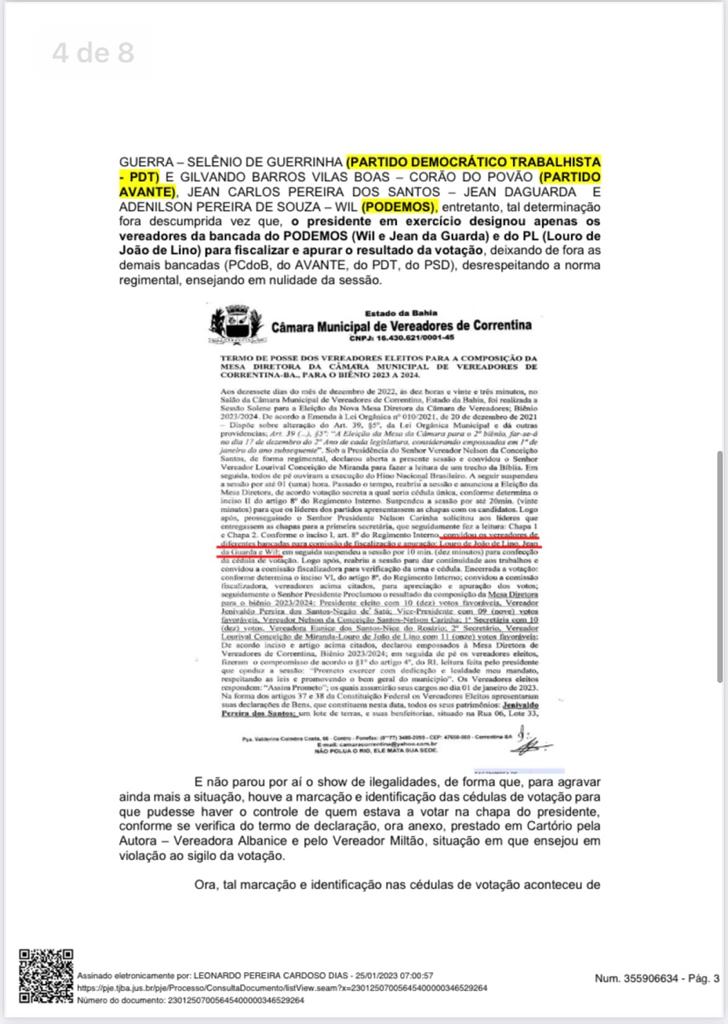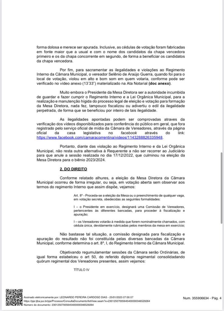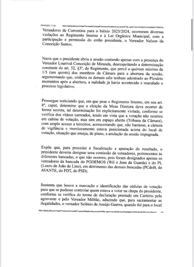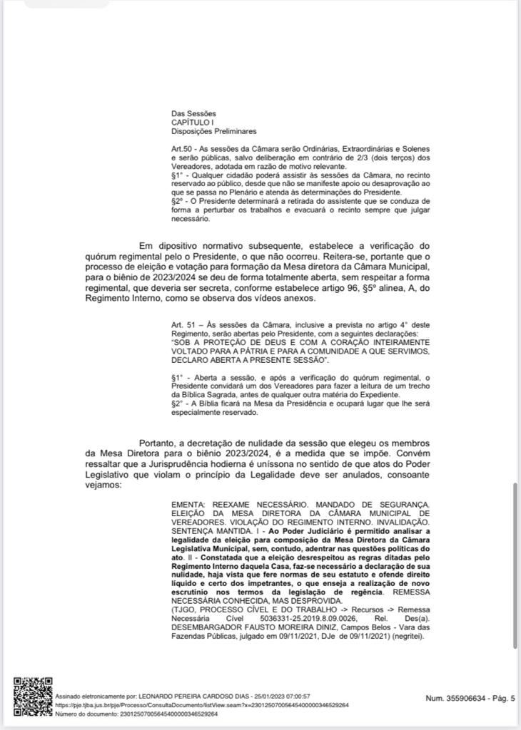 Que a sessão não ocorreu de forma secreta; que o local para macacão das cédulas de votação não possuía qualquer proteção para preservar o sigilo do voto; que a câmara de vigilância e monitoramento estava posicionada em cima da tribuna (local da votação) local a verificar em quem cada vereador votou; que não foi criada a comissão preenchida com membros de diversos partidos, mas tão somente com os vereadores do PODEMOS: Wil e Jean e do PL, Louro de João de Lino. Diante das alegações para anulação da sessão e, consequentemente, da eleição da Mesa Diretora, alegando diversas irregularidades, vereadora não obteve êxito.