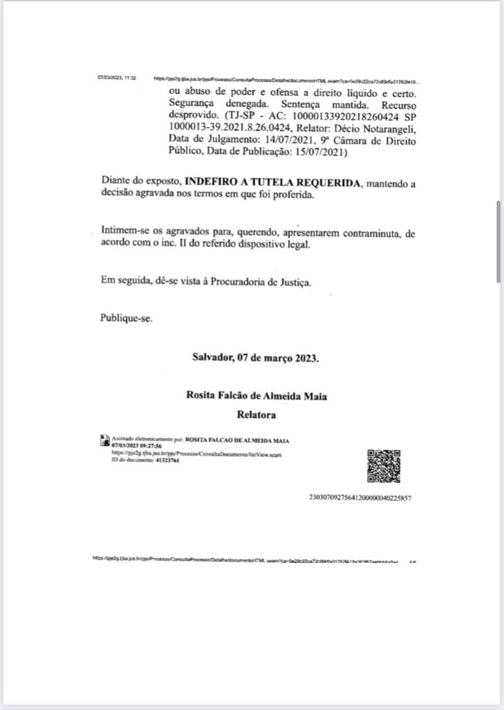 Como é de direito recorrer a outras instâncias, a vereadora não conformada com a decisão proferida pelo juiz da Comarca, interpôs Agravo de Instrumento ao TRIBUNAL DE JUSTIÇA, SEGUNDA INSTÂNCIA, com pedido de efeito suspensivo, em detrimento da decisão do Juiz, foi indeferido a TUTELA, mantendo a decisão nos mesmos termos que foi proferida.