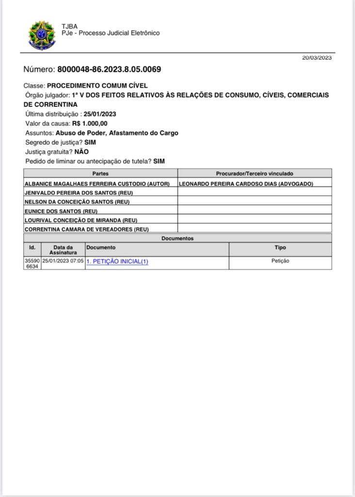 A Ação Ordinária com Pedido de Tutela de urgência Inaudita Pars, sem que se abra vista ao réu, promovida pela vereadora Albanice Magalhães Ferreira correu em segredo de justiça. Na petição inicial a requerente alegou que ocorreram diversas violações ao regimento interno da Câmara durante o processo de votação, com a participação e permissão do ex-presidente, o vereador Nelson Conceição (Nelson Carinha) (PC do B), onde não verificaram o quórum de 1/5 dos membros da casa para dá início a sessão, abrindo-a tão somente com a presença do vereador Louro de João de Lino