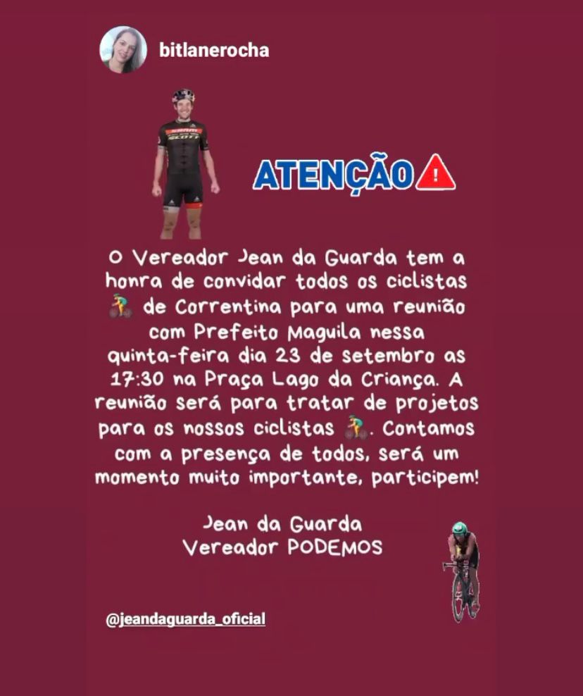 De iniciativa do Vereador Jean da Guarda, do PODEMOS, ontem, 24, no deck da praça do Lago da Criança foi realizada uma reunião, ao ar livre, com o Prefeito Maguila, equipe técnica de engenheiros e os ciclistas de Correntina.