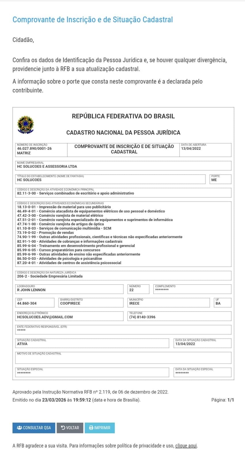 De acordo com dados oficiais, a empresa foi criada em 2022, ou seja, possui pouco tempo de atuação no mercado. Além disso, seu ramo principal não é especificamente a organização de concursos públicos, mas sim serviços de escritórios e administrativos, conforme comprovante nacional de pessoa jurídica da Receita Federal, pesquisado em 23/3/2026.