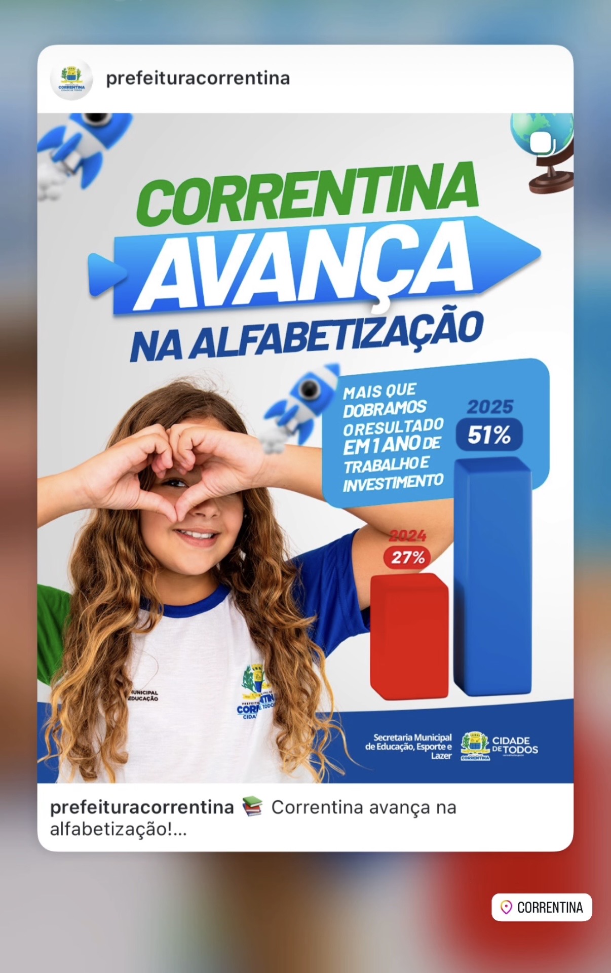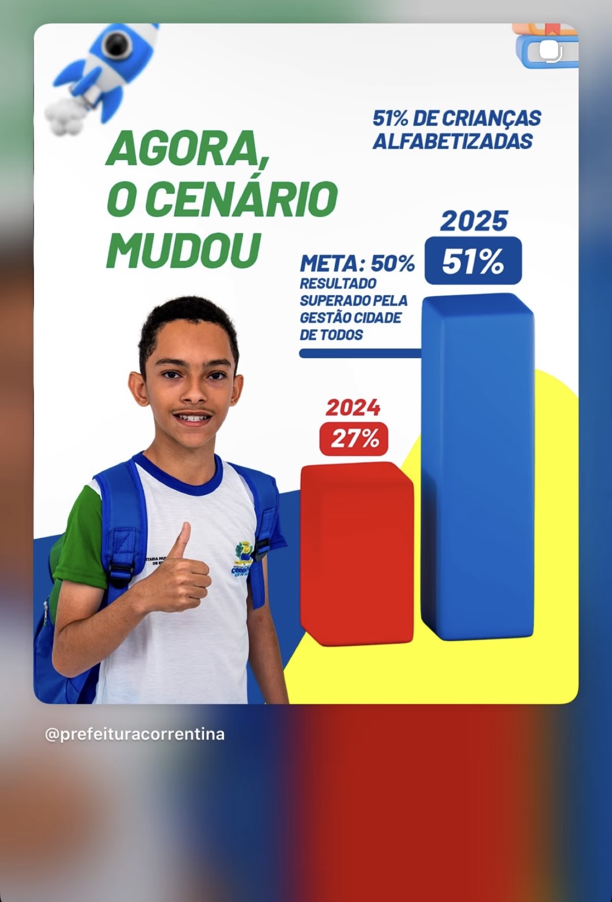 Mesmo não atingindo a meta nacional e permanecendo atrás da média do estado da Bahia, Correntina teve um grande salto, subindo 27% em um ano e cravando a marca de 51% das crianças alfabetizadas no segundo ano.