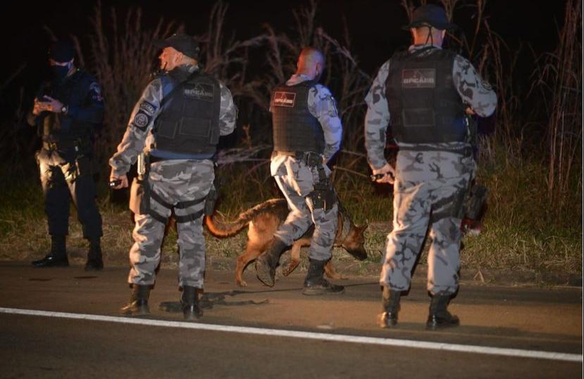 Neste momento, policiais fazem buscas na mata com a ajuda de cães farejadores.