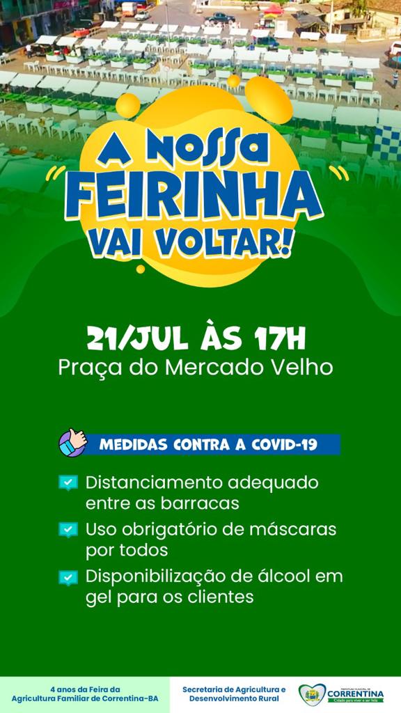 O prefeito Maguila, em sua data de aniversário resolveu dar uma festa ao povo correntinense, trazendo de volta a FEIRINHA da agricultura familiar que é um sucesso, com comidas típicas às quartas-feiras, mas atração do forró está suspensa provisoriamente até o fim da pandemia.