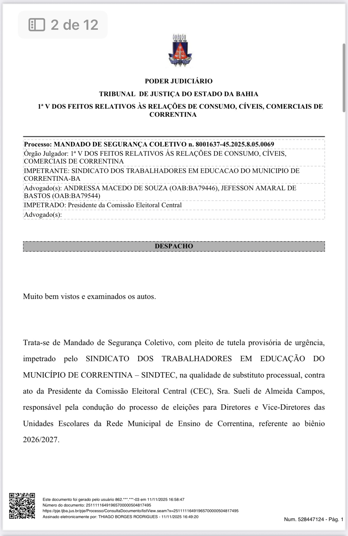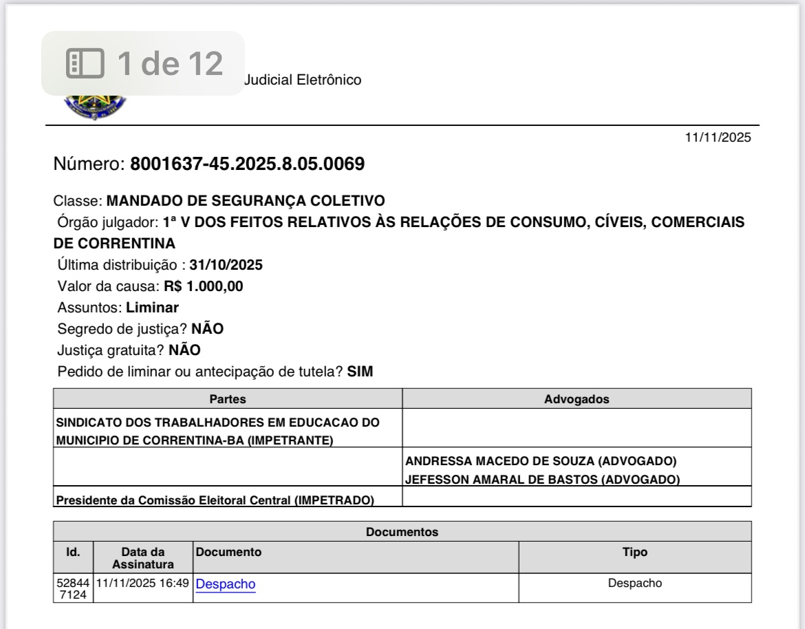 A Justiça de Correntina voltou a reafirmar o que a lei já garante: a participação democrática não pode ser restringida por interpretações burocráticas. Em decisão proferida pelo Juiz Thiago Borges Rodrigues, da 1ª Vara dos Feitos Relativos às Relações de Consumo, Cíveis e Comerciais, foi concedida liminar em favor do Sindicato dos Trabalhadores em Educação do Município de Correntina (SINDTEC), assegurando o direito de substituição de chapa nas eleições para diretores escolares da rede municipal.