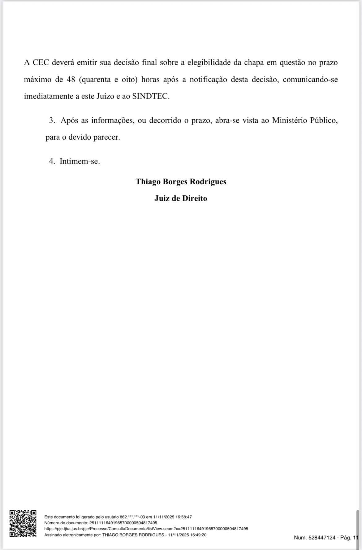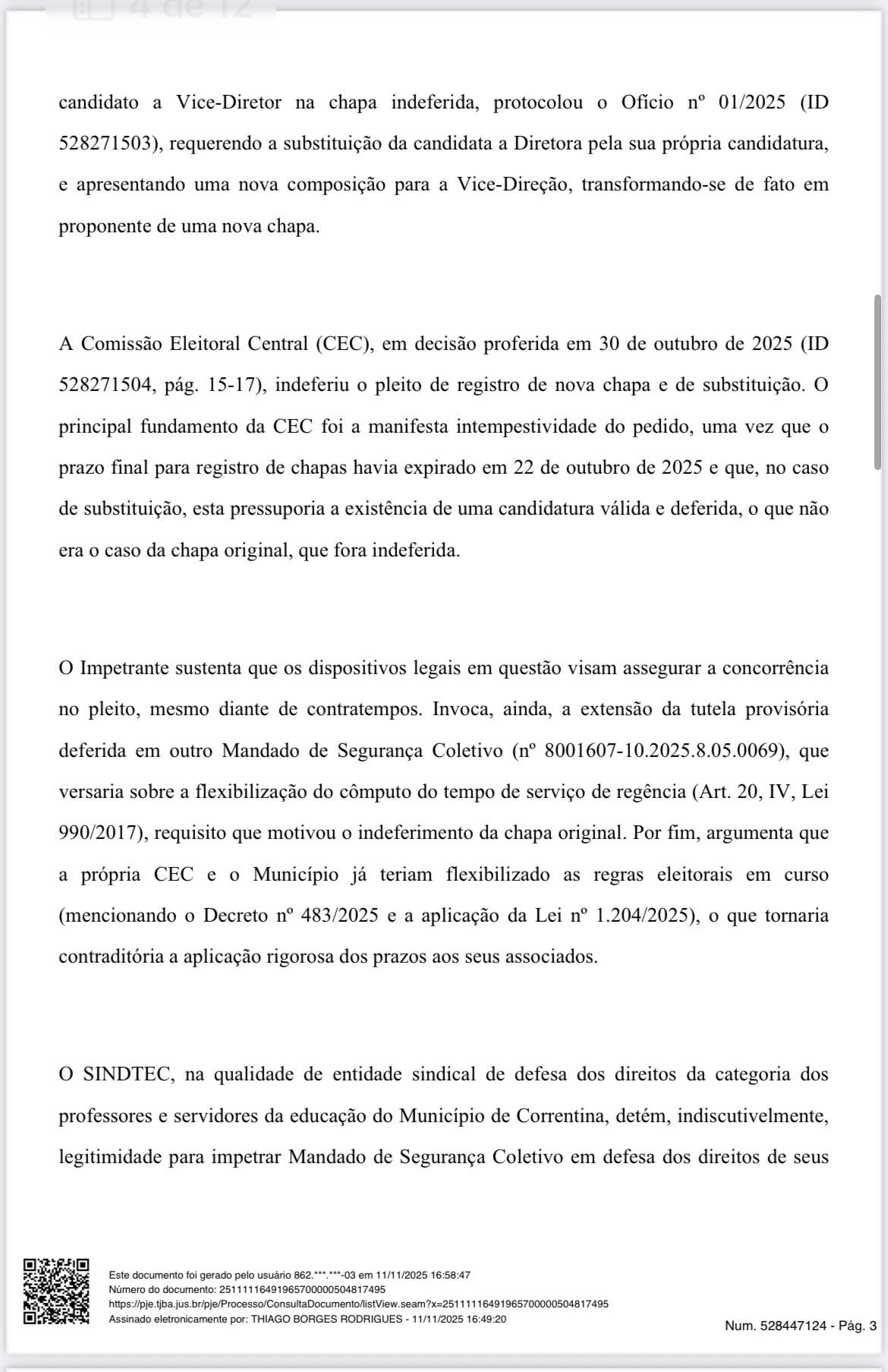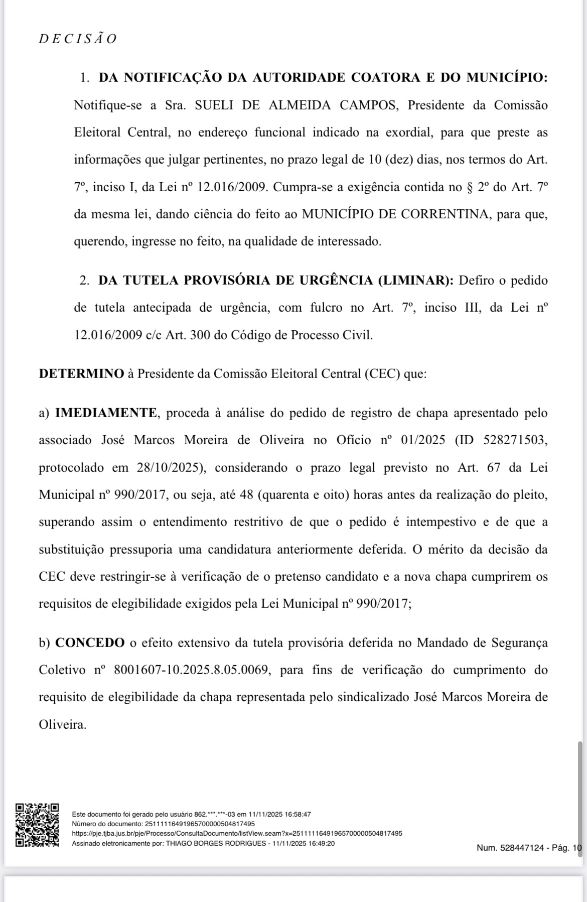 Ao deferir a liminar, o juiz determinou que a Comissão Eleitoral Central proceda imediatamente à análise do novo registro, considerando o prazo legal e afastando o entendimento restritivo que impedia a substituição. A decisão também estende os efeitos de outra liminar concedida em processo semelhante, reforçando o princípio da isonomia, da ampla concorrência e da gestão democrática.