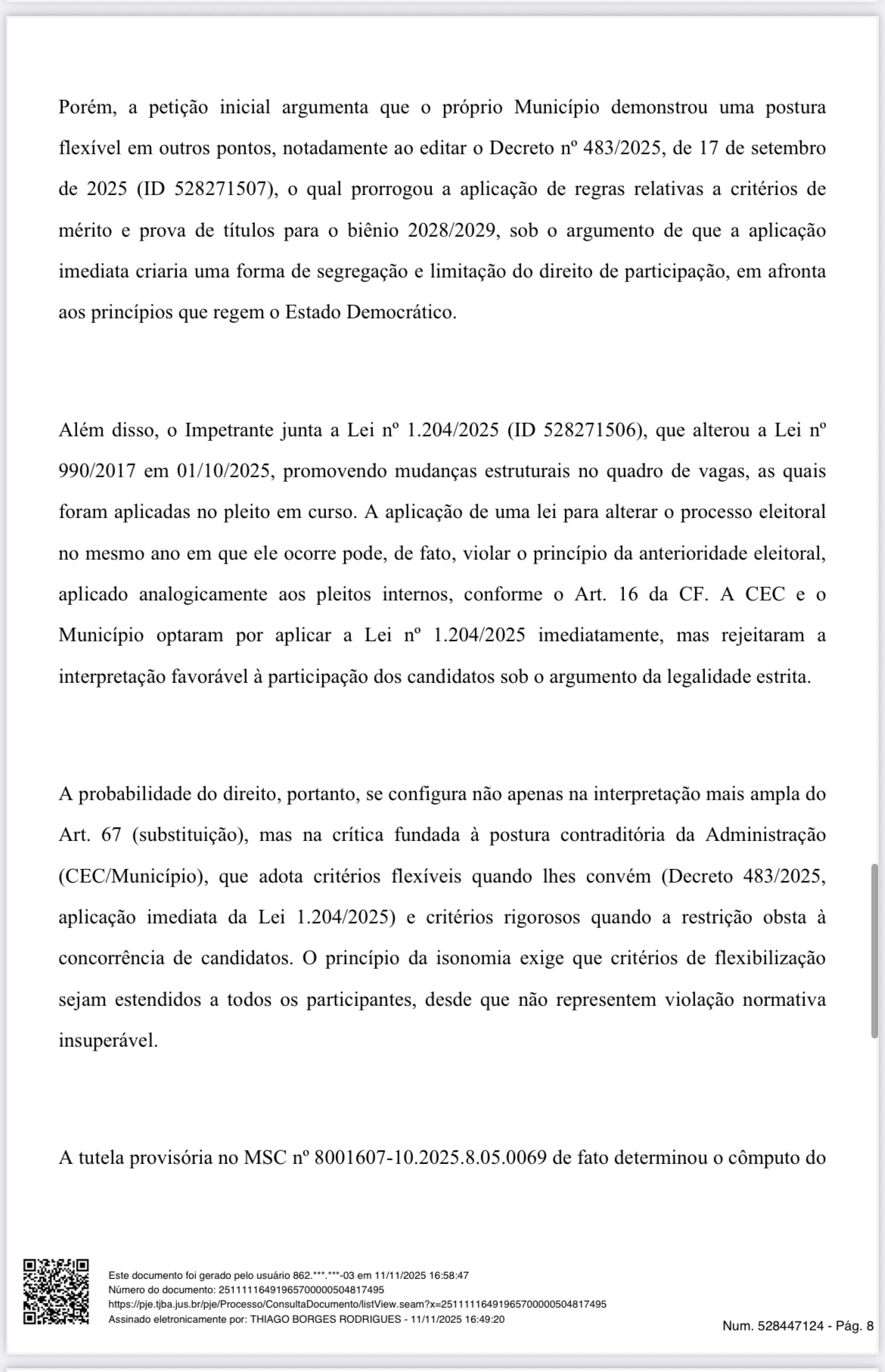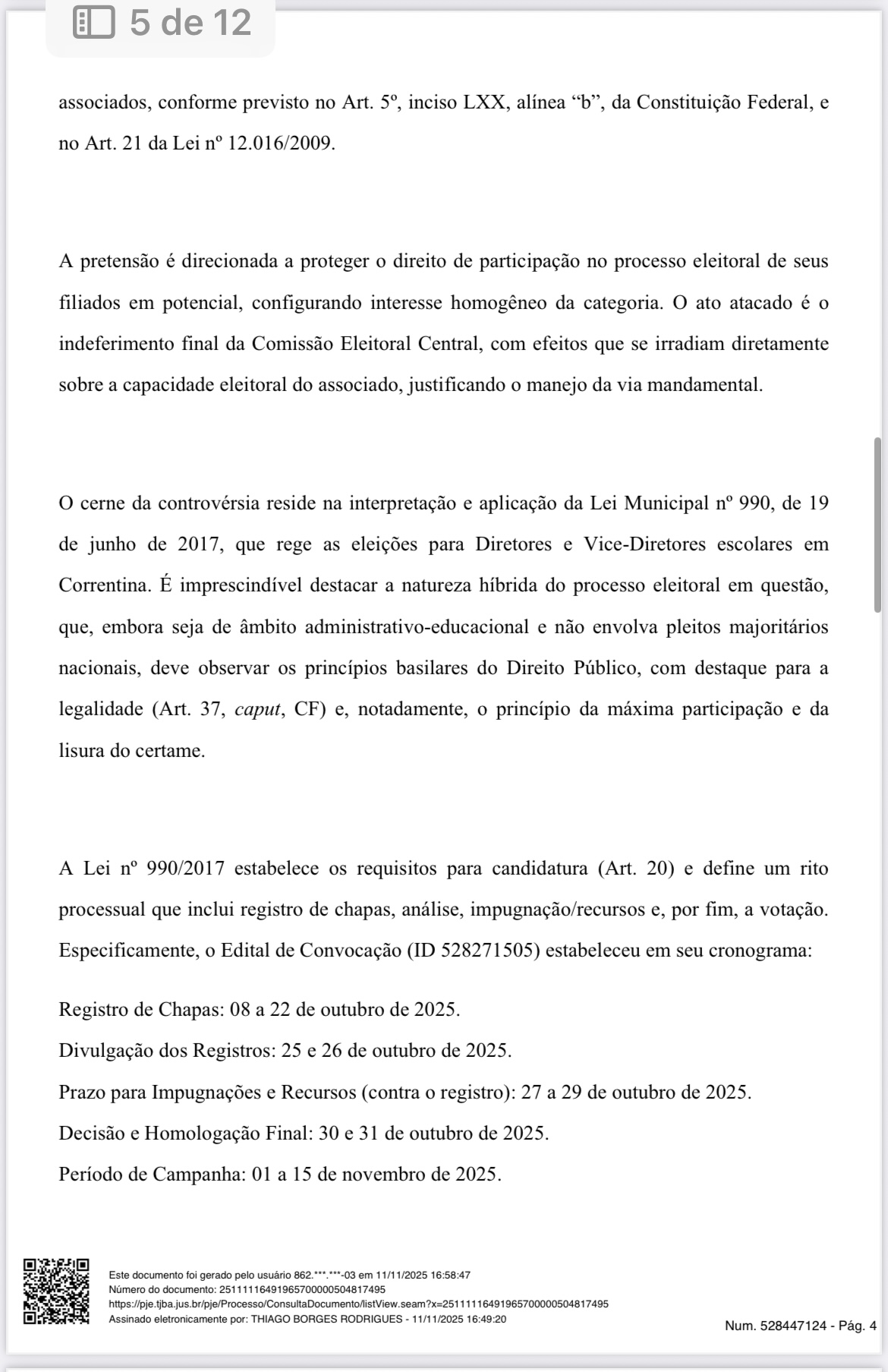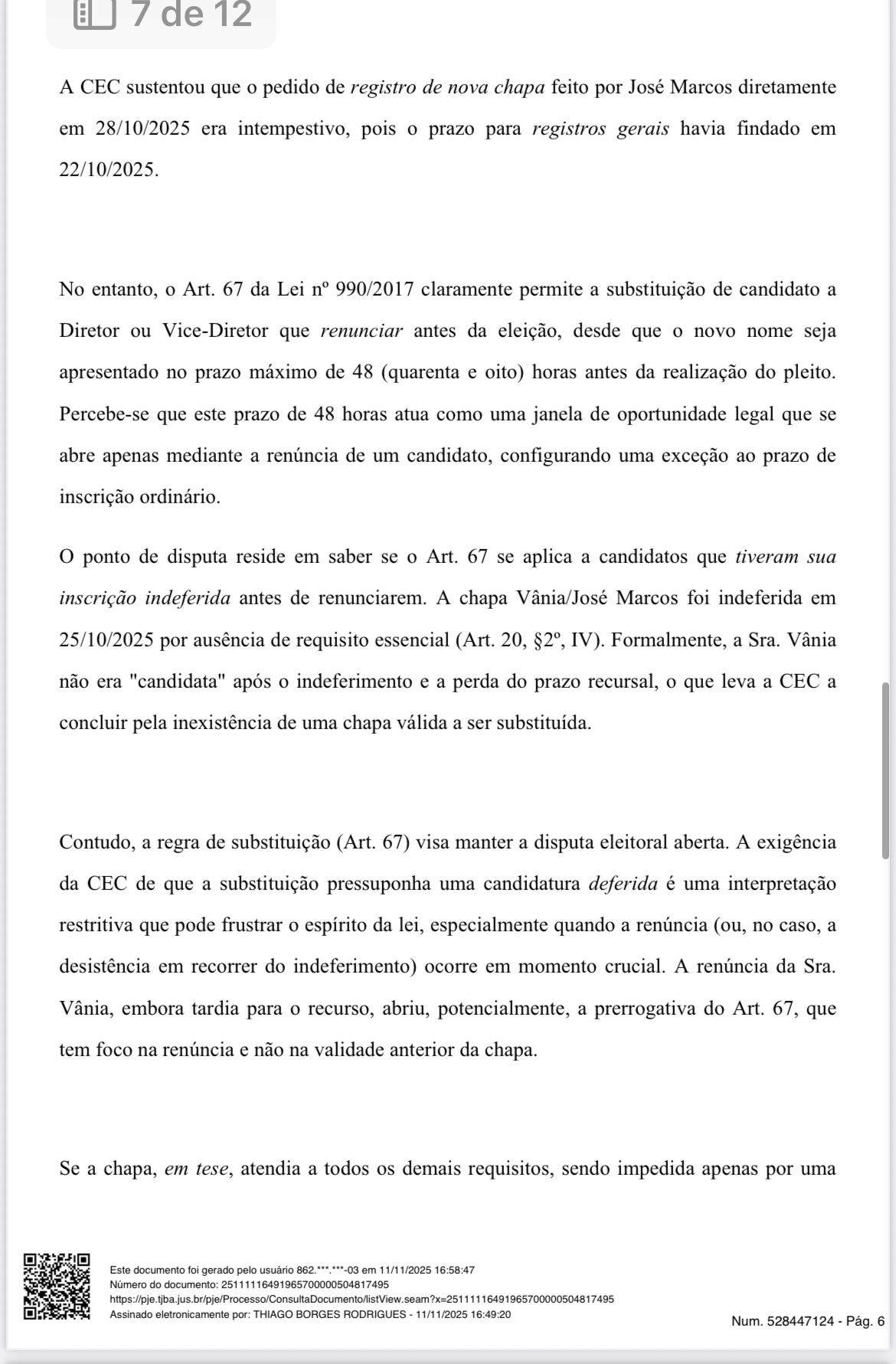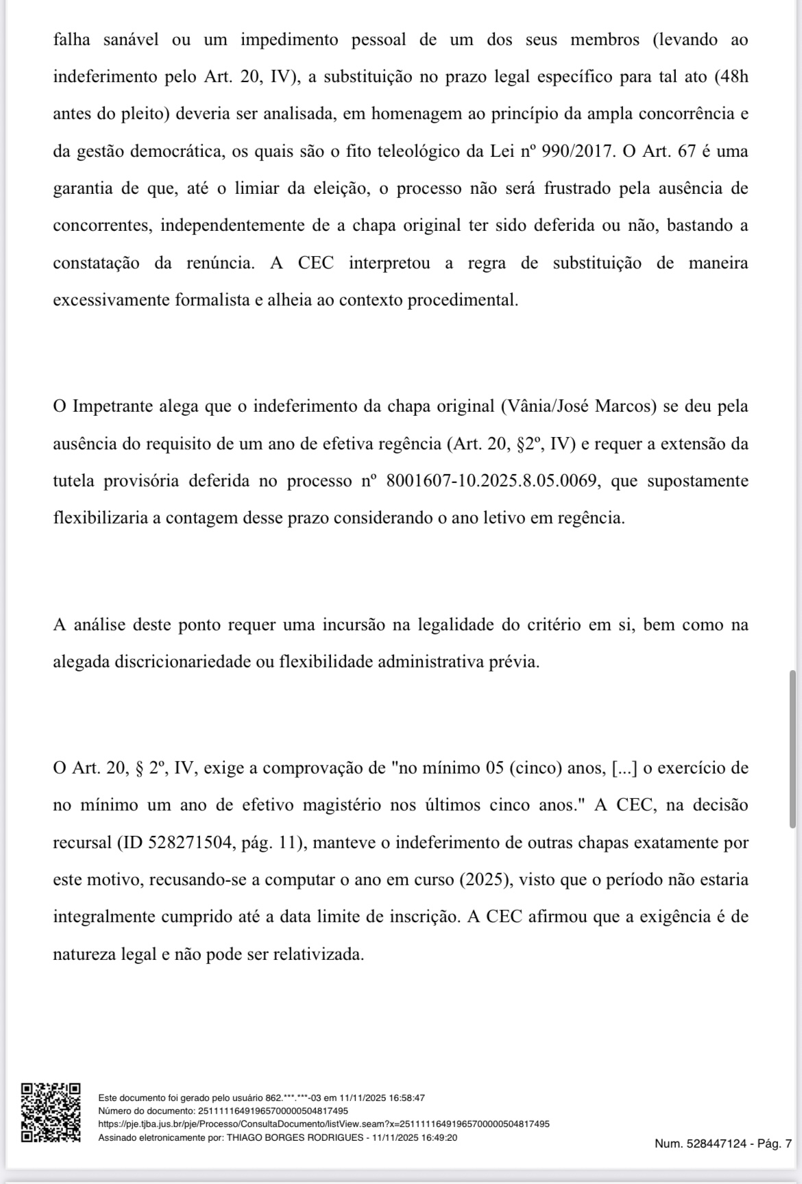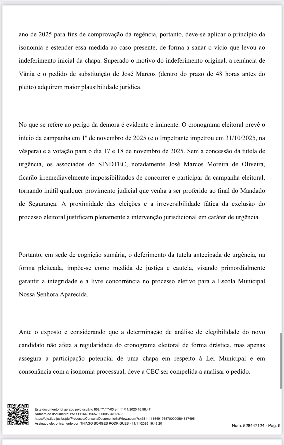A decisão reconhece que a Lei Municipal nº 990/2017, em seu artigo 67, é clara ao garantir o direito de substituição de candidatos até 48 horas antes da eleição, em casos de renúncia. A candidata Vânia de Souza Queiroz Durães, que havia tido o registro de sua chapa indeferido, assinou desistência de recorrer da decisão da Comissão Eleitoral Central (CEC), abrindo assim o direito à formação de nova chapa, encabeçada pelo sindicalizado José Marcos Moreira de Oliveira, para concorrer à direção da Escola Municipal Nossa Senhora Aparecida, no Distrito do Rosário.