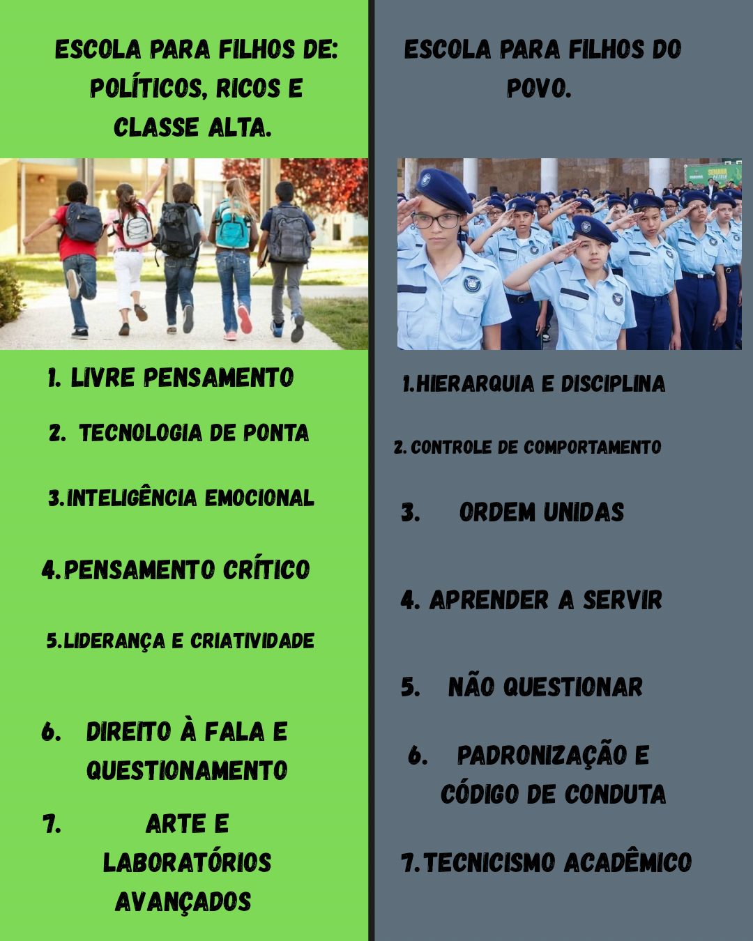 Existe uma pergunta que precisa ser feita com coragem: por que os filhos dos ricos, dos políticos e das famílias influentes não estudam nesse modelo? Os filhos da elite e da classe média alta estudam em escolas humanistas, com professores qualificados, bibliotecas, projetos, idiomas, arte, debate, psicologia escolar e incentivo à autonomia. Eles aprendem a argumentar, a liderar, a lidar com sentimentos e a pensar com liberdade.