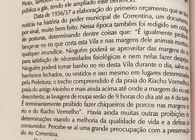 cuidados sanitários e ambientais, além da proteção do rio e de todas as espécies de vida. A existência de tal legislação é atestada por Hélverton Baiano, no seu clássico “História de Correntina”. Consta que muita gente testemunhou as reprimendas do Major, ao mobilizar todo o seu efetivo de segurança contra quem ousasse transgredir as leis municipais. Afinal, o que teria provocado esse insight no Major e de onde lhe veio esse surto de consciência? Não se sabe exatamente, mas o fato é que à época as águas do correntina corriam límpidas e cristalinas.