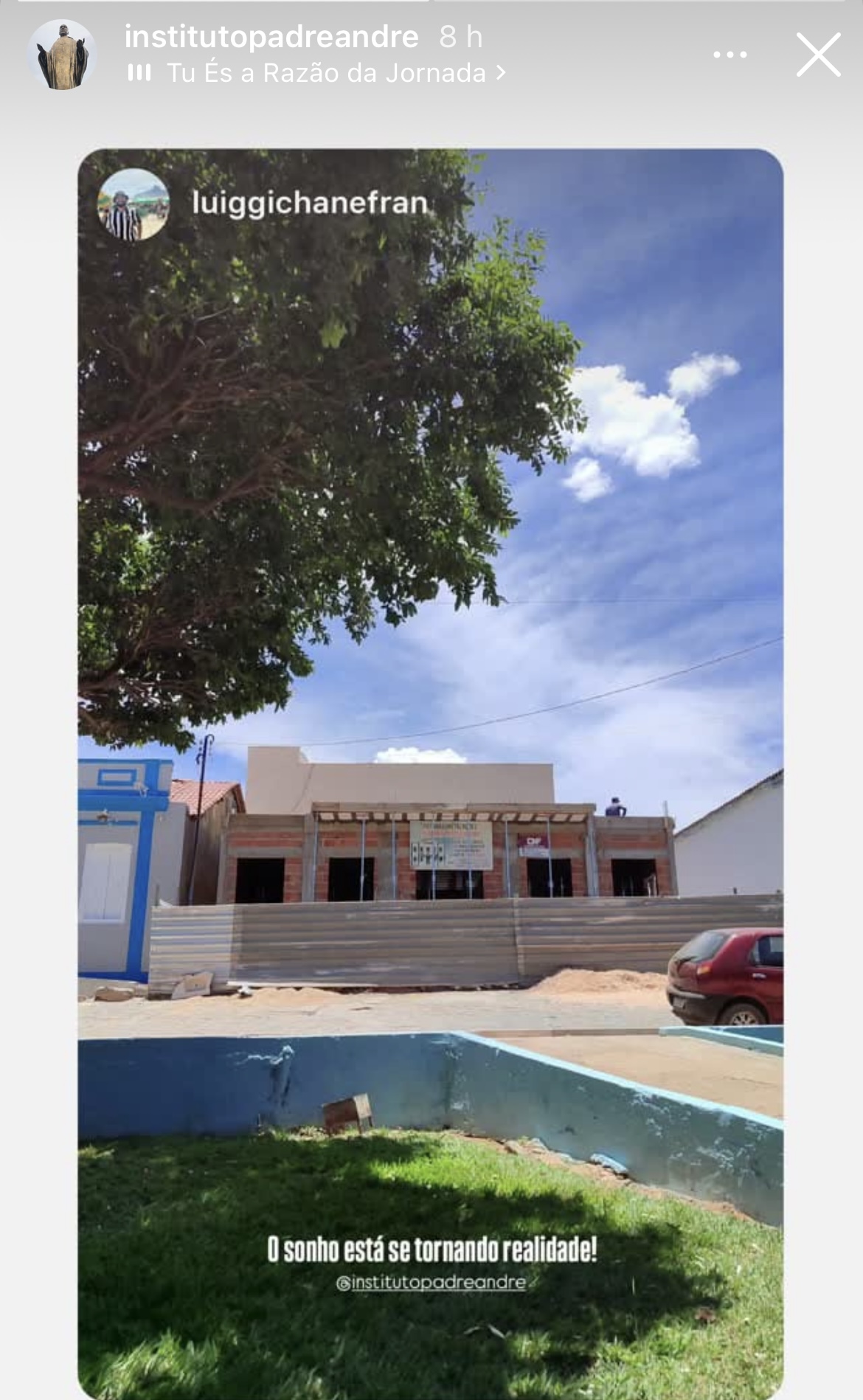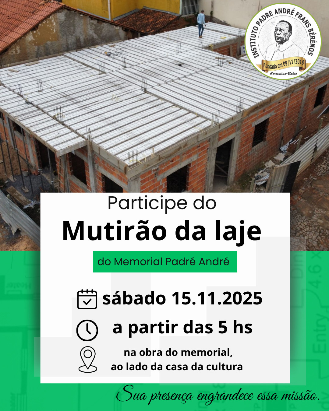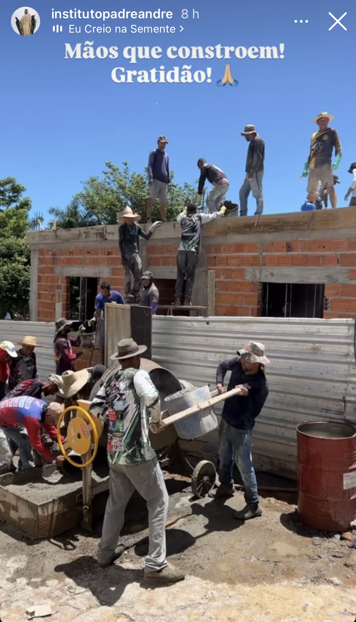 Eu, Luciano Pedreiro, participo de mutirões há muitos anos, construindo casas nas comunidades rurais mais carentes. Ontem, 15/11, participei de um mutirão diferente: ajudei no mutirão do Instituto Padre André. Foi uma experiência especial; senti que retribuía, ainda que pouco, a alguém que fez tanto pela nossa cidade.