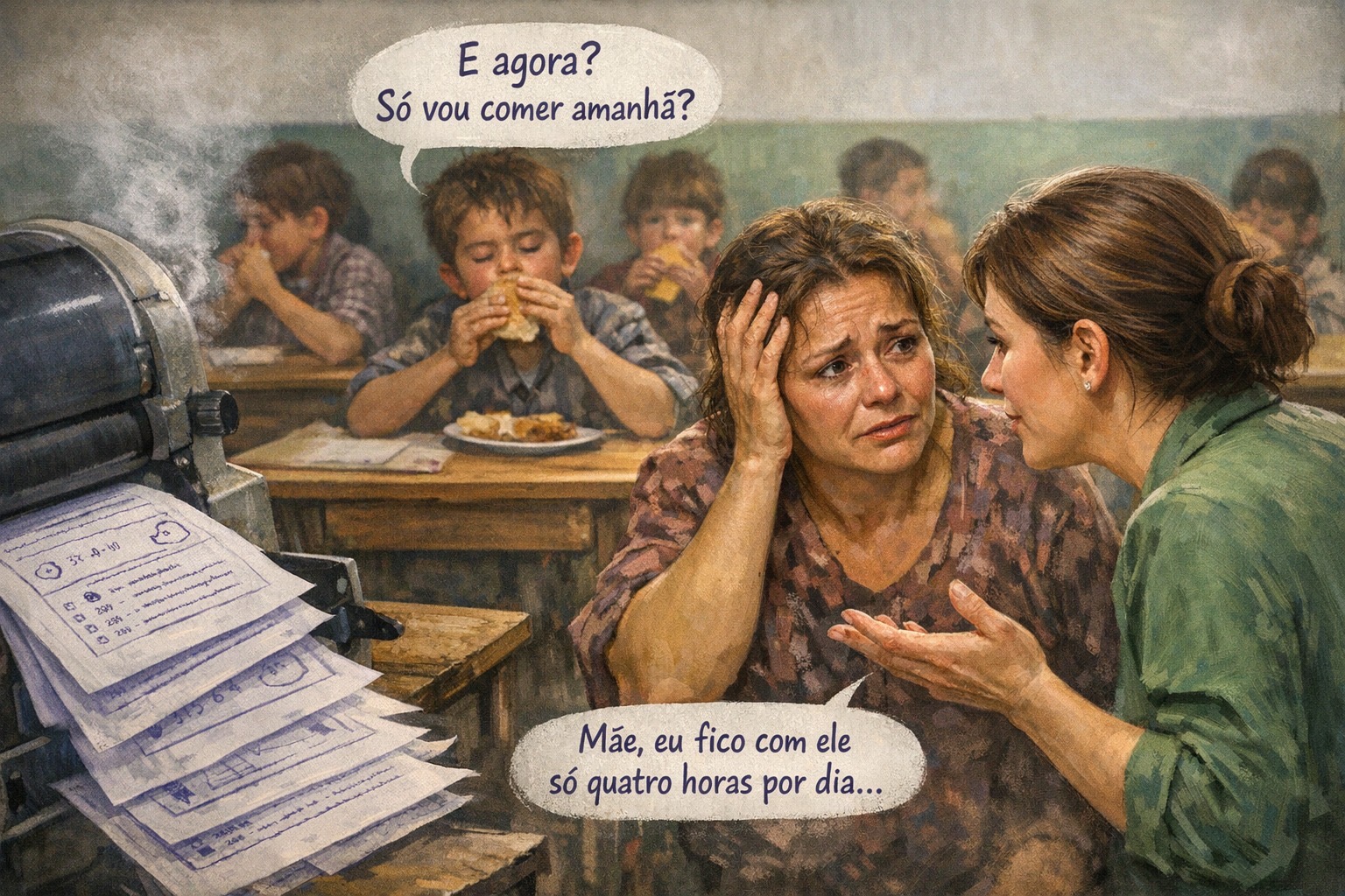 Com o coração apertado, professores remexiam bolsas e carteiras em busca de moedas e corriam ao armazém mais próximo para trazer um pouco de dignidade embrulhada no papel pardo, numa tentativa de impedir que a fome matasse sonhos.