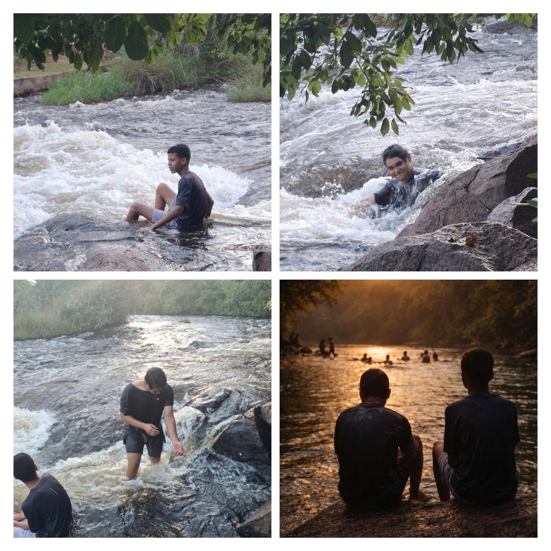 Atravessamos a ponte, passamos por uma cerca de arame e, entre árvores, cipós e grandes rochas, finalmente chegamos. O lugar era bom, mas sem a estrutura organizada da área próxima à Praça Verde. Eu nem cheguei a entrar na água. Eles, depois de alguns mergulhos, caminharam contra a correnteza até alcançar uma pequena cachoeira. Talvez tenham aproveitado uma breve hidromassagem natural.