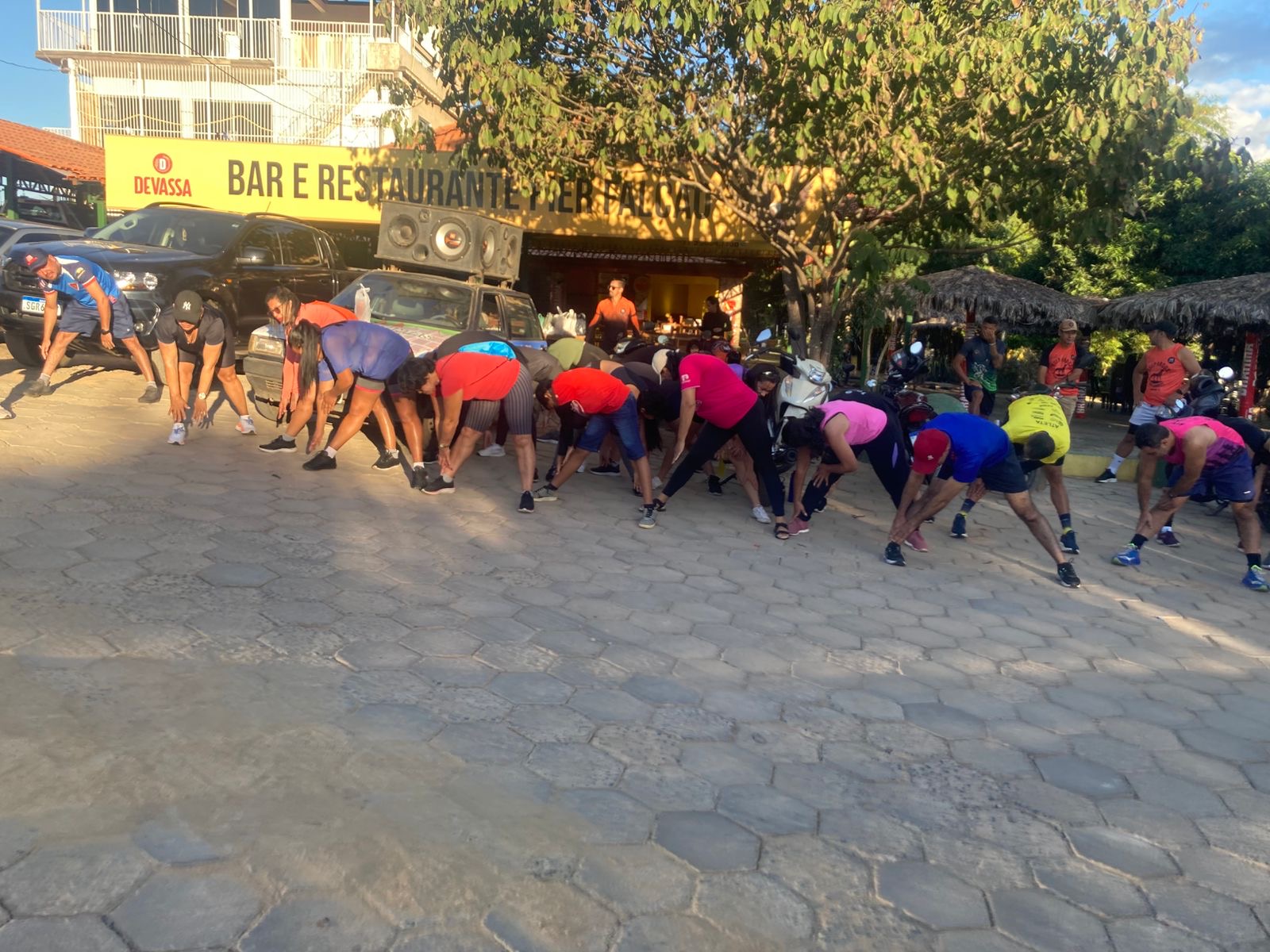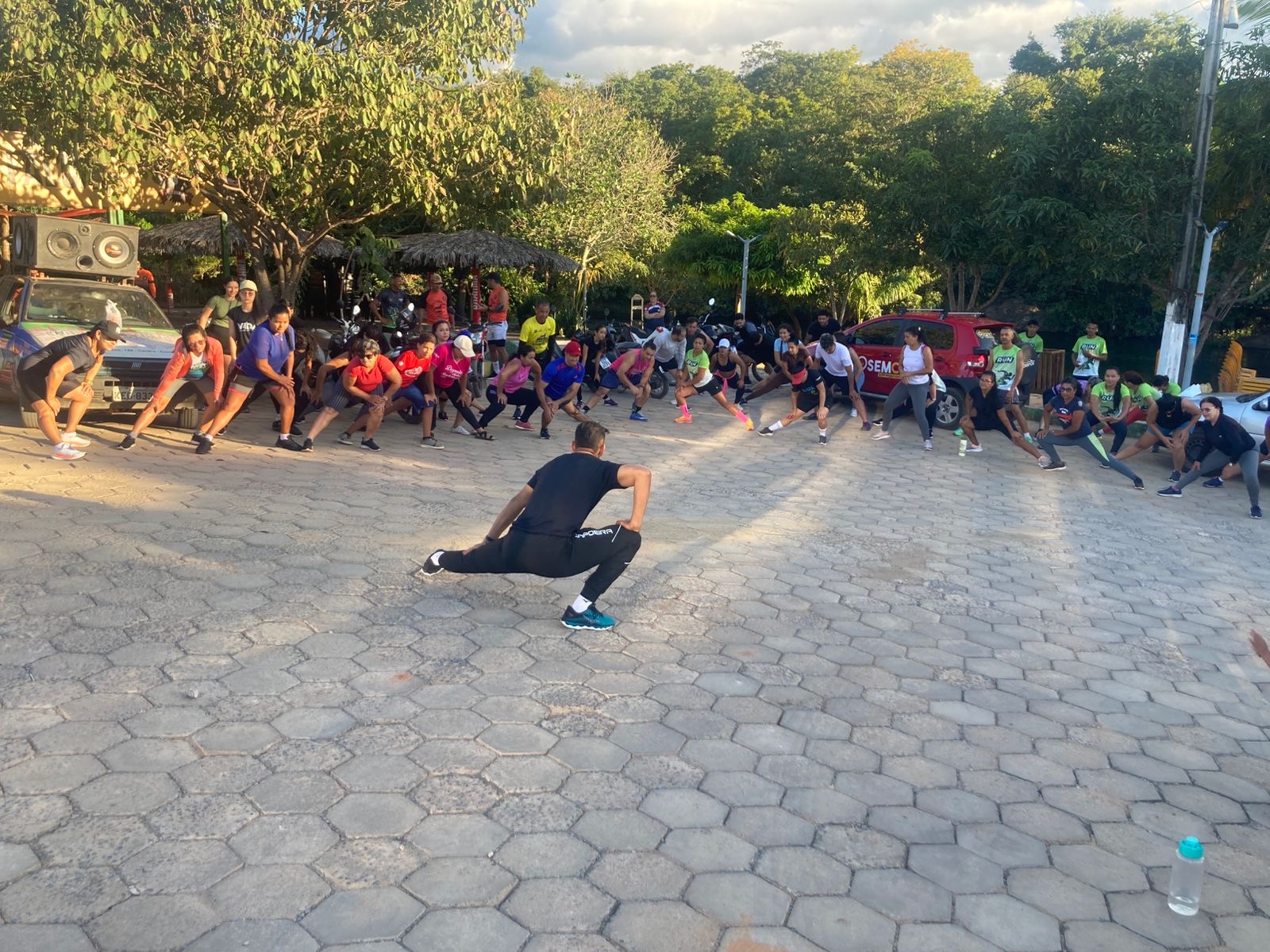 Sob a condução do mestre, todos alongaram os músculos. Havia um povo fardado, o estilo era diferenciado. Saltavam, elevavam intercaladamente os joelhos fazendo semicírculos no ar, tipo atletas de verdade. Uma simples caminhada não caberia em seus preparos. Não coube.